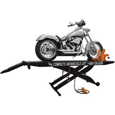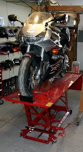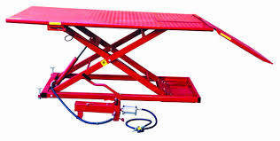 A motorcycle lift is a lift table that is designed to handle motorcycles. Many repair shops use such lifts to bring the vehicle off of the ground and up to a level so that the mechanic does not have to put any strain on his or her back or lay upon the ground to perform any kind of work upon the vehicle.